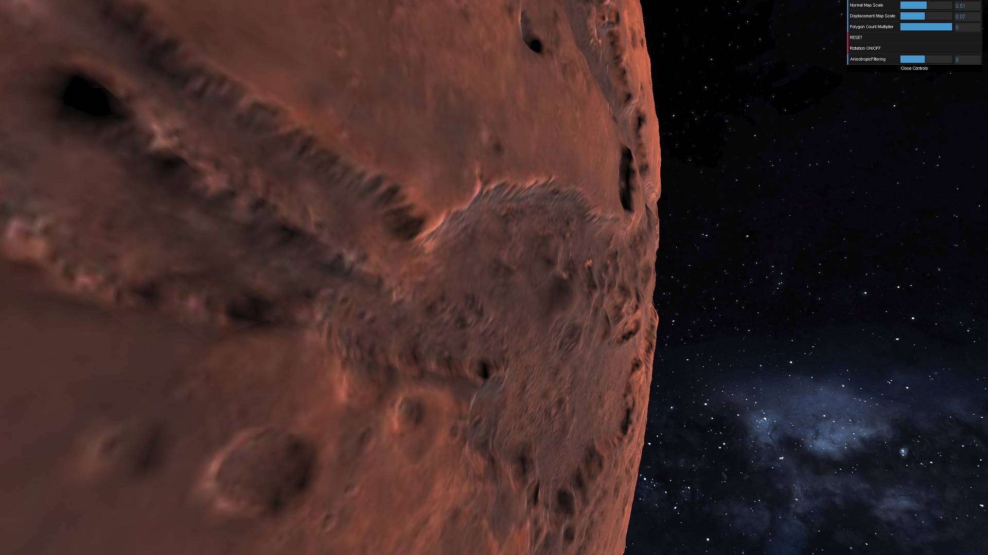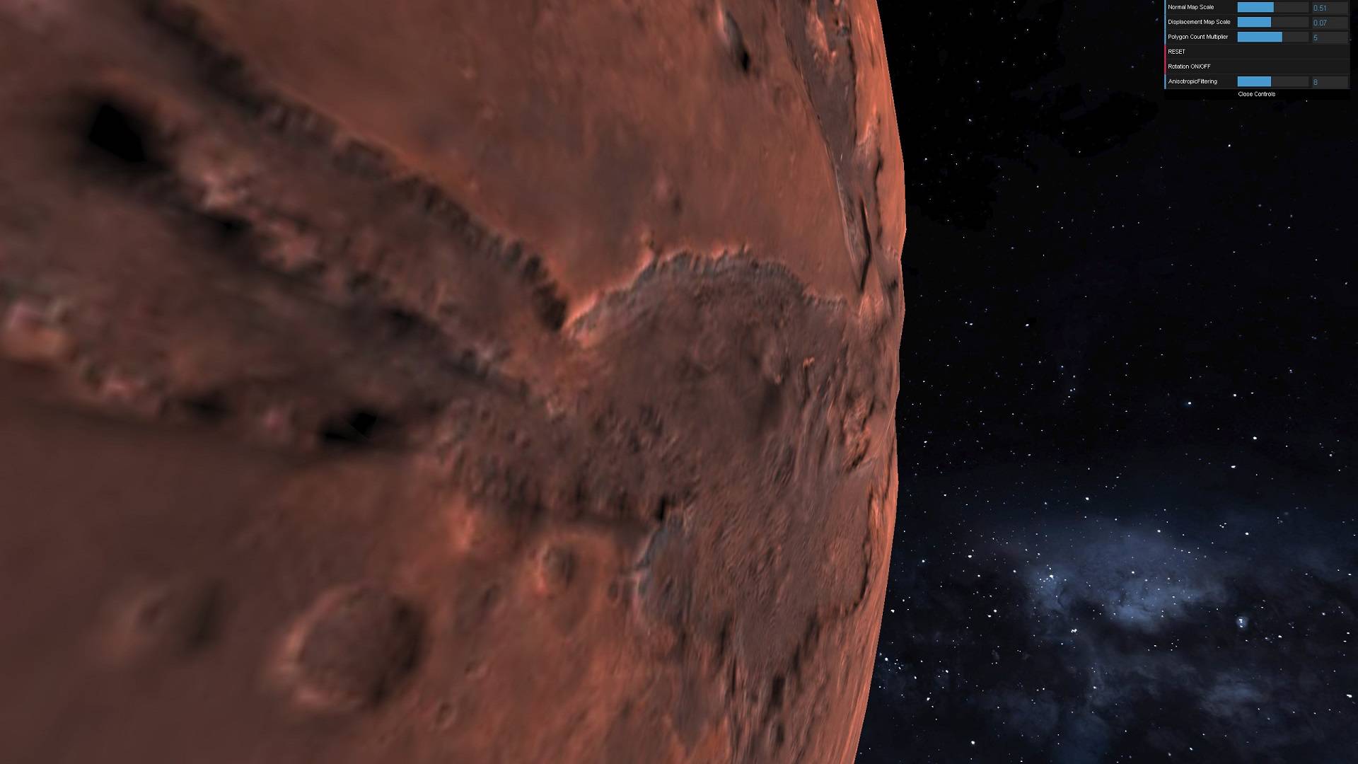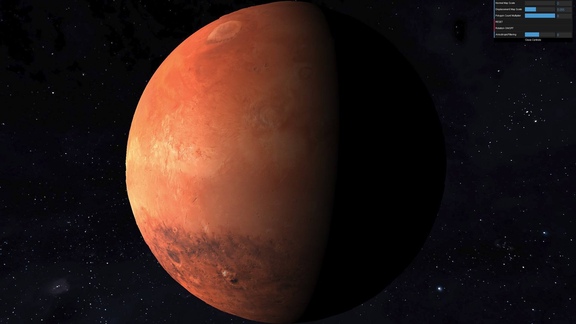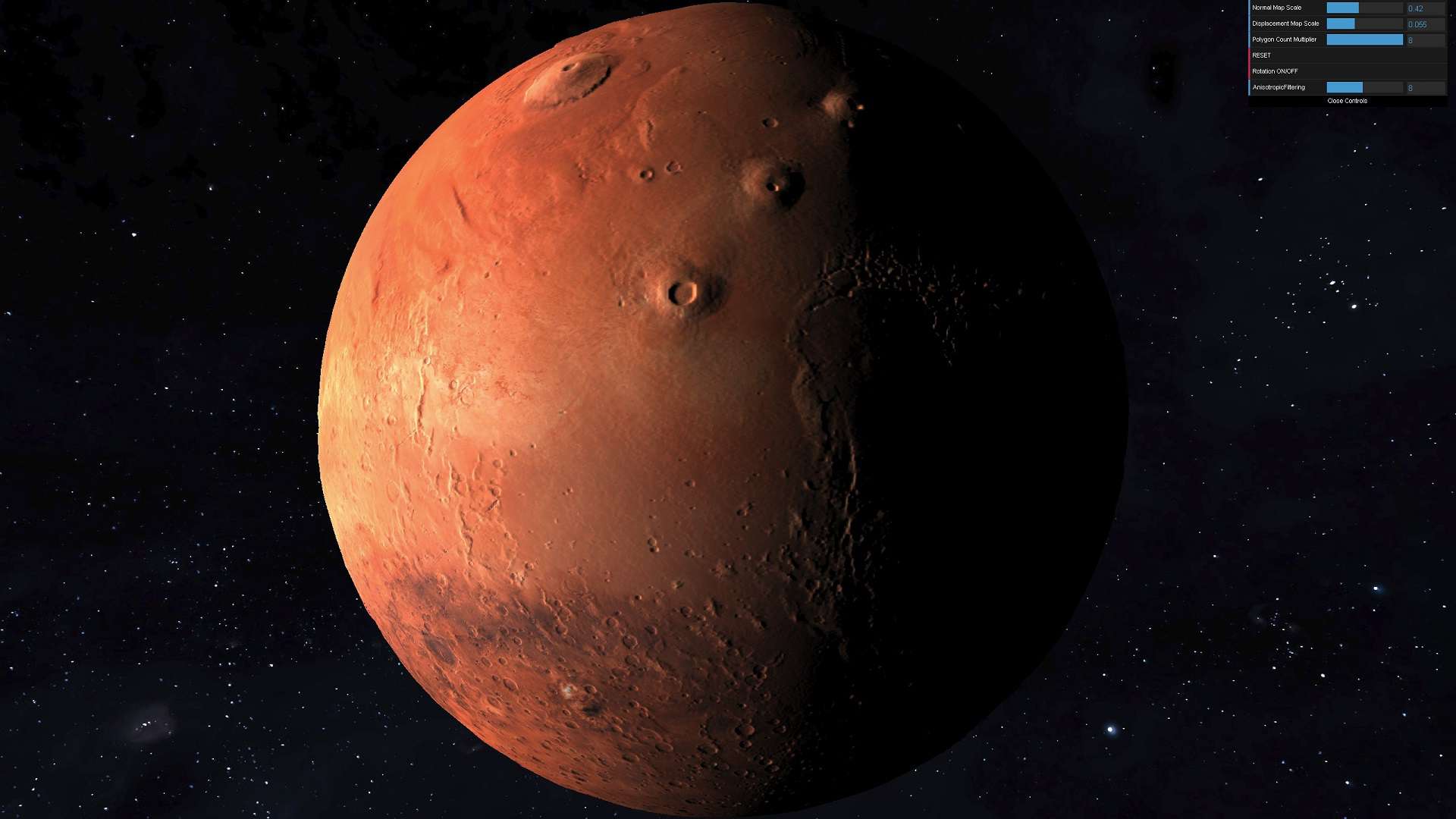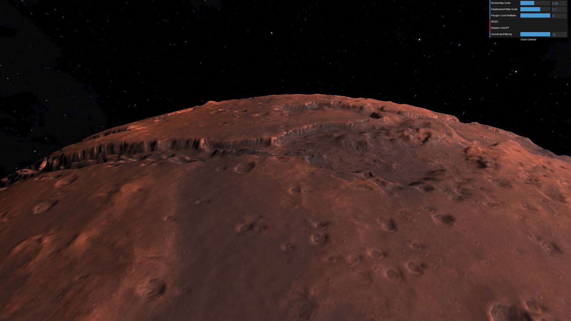 Voici un comparatif de la surface de Mars, avec le Displacement Mapping désactivé (Image 1) puis activé (Image 2):