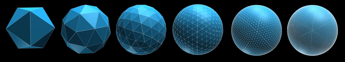 Après un nombre suffisant de divisions, L'IcosaHedron ressemble à s'y méprendre à une sphere. En comparaison à une sphère classique, l'IcosaHedron offre une meilleure répartition de la densité de vertex. En effet, sur une sphère classique, on peut observer une densité plus élevée de vertex aux sommets et une densité plus faites à l'équateur, et on peut noter également que la sphère utilise des "quads", soit 4 vertex dans le même plan. L'IcosaHedron permet alors un plus grand niveau de détail pour un nombre égal de vertex.