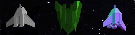 Les vaisseaux du joueur et des ennemis sont des objets 3D modélisés sous Blender. Ils ont été exportés en .obj puis chargés dans le jeu en temps que THREE.Mesh grâce à la bibliothèque OBJLoader. Le matériau utilisé pour les vaisseaux est le matériau "Standard", qui offre un aspect métallisé grâce aux effets de réflexion spéculaire supporté par ce matériau. Afin de mieux discerner les vies et pouvoir profiter pleinement des détails du modèle 3D, les vaisseaux représentant les vies du joueur en haut à droite de l'écran utilisent eux un matériaux "Normal", dont la couleur de surface dépend de l'orientation des normales faces à la caméra. Ce matériau, par défaut, ne subit pas l'éclairage de la scène, toute surface du matériau est donc éclairée quel que soit son orientation, ce qui permet, combiné aux couleurs, d'attirer le regard du joueur.